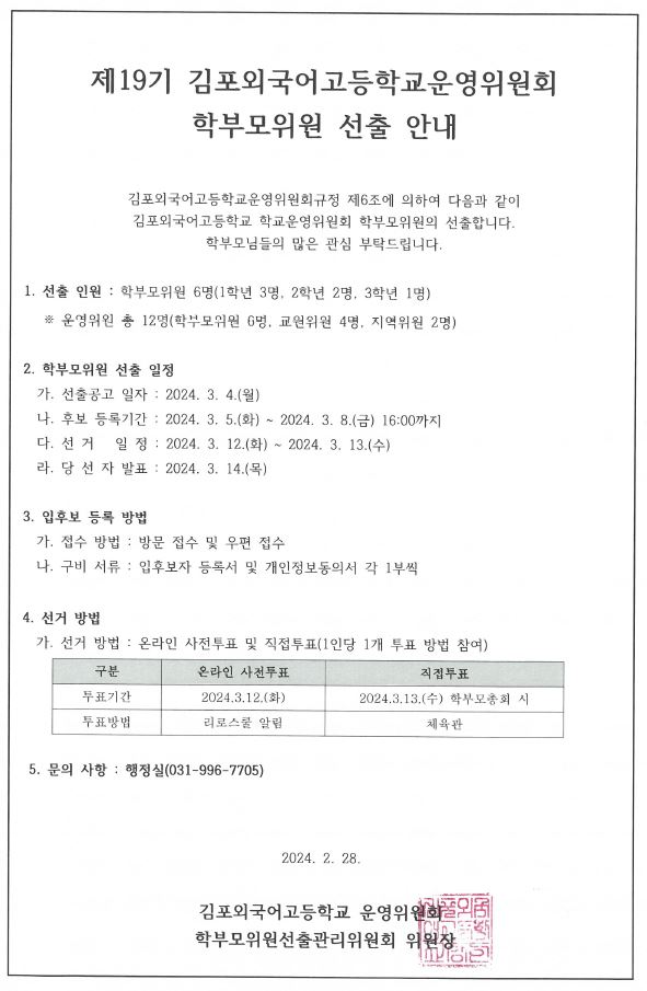 2024Çг⵵ Á¦19±â ±èÆ÷¿Ü±¹¾î°íµîÇб³¿î¿µÀ§¿øÈ¸ ÇкθðÀ§¿ø ¼±Ã⠾ȳ»