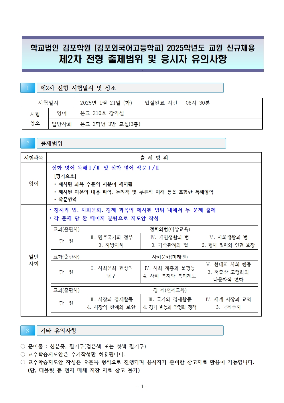2025Çг⵵ Çб³¹ýÀÎ ±èÆ÷Çпø(±èÆ÷¿Ü±¹¾î°íµîÇб³)±³¿ø ½Å±Ô ä¿ë(¿µ¾î, ÀϹݻçȸ) Á¦2Â÷ ÀüÇü ÃâÁ¦¹üÀ§ ¹× ÀÀ½ÃÀÚ À¯ÀÇ»çÇ× ¾È³»