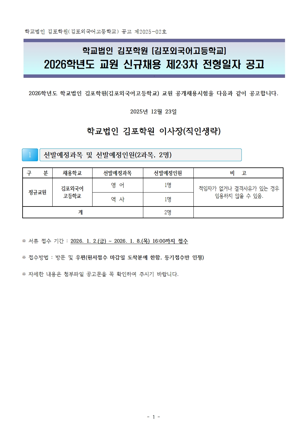2026Çг⵵ Çб³¹ýÀÎ ±èÆ÷Çпø(±èÆ÷¿Ü±¹¾î°íµîÇб³)±³¿ø ½Å±Ô ä¿ë(¿µ¾î, ¿ª»ç) 2,3Â÷ ½ÃÇà°èȹ °ø°í