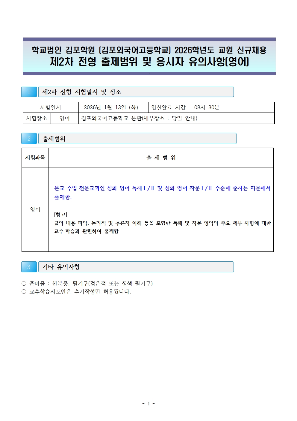 2026Çг⵵ Çб³¹ýÀÎ ±èÆ÷Çпø(±èÆ÷¿Ü±¹¾î°íµîÇб³)±³¿ø ½Å±Ô ä¿ë(¿µ¾î) Á¦2Â÷ ÀüÇü ÃâÁ¦¹üÀ§ ¹× ÀÀ½ÃÀÚ À¯ÀÇ»çÇ× ¾È³»